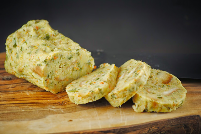 U originalnom receptu se navodi da se povrće pirja dok ne omekša i trebalo bi se ga svog narezati na kockice jednake veličine. Kako je meni ostalo pire krumpira od ručka prethodnog dana tako sam odlučila njega iskoristiti a povrće sam sitno izmljela u multipraktiku. Prijedlog za serviranje su bile knedle prelivene sa malo rastopljenog maslaca i posipane krušnim mrvicama. Moj mesožder se užasnuo prijedlogom da samo knedle budu ručak pa smo ih mi jeli sa goveđim gulašem. E da i ja sam nekako navikla kuhati knedle u obliku štruce, nekako su manje vodenaste nego kad ih kuham baš kao knedle.